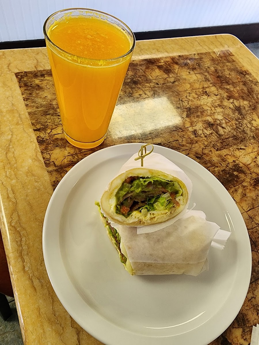 Flour tortilla filled with Rice, black beans, lettuce, mozzarella, pico de gallo, guacamole and steak