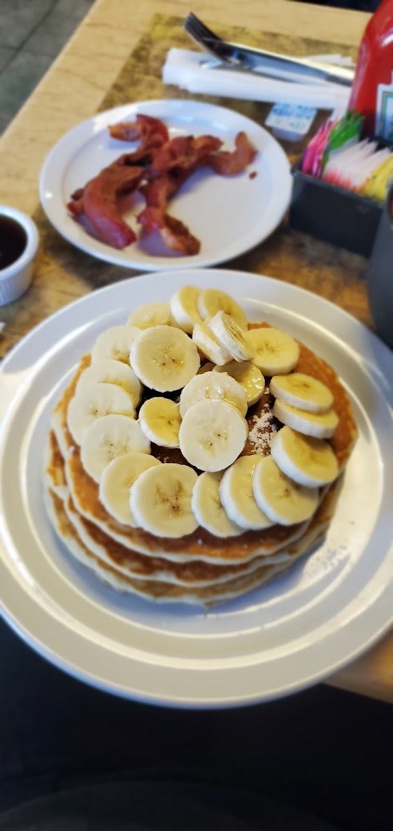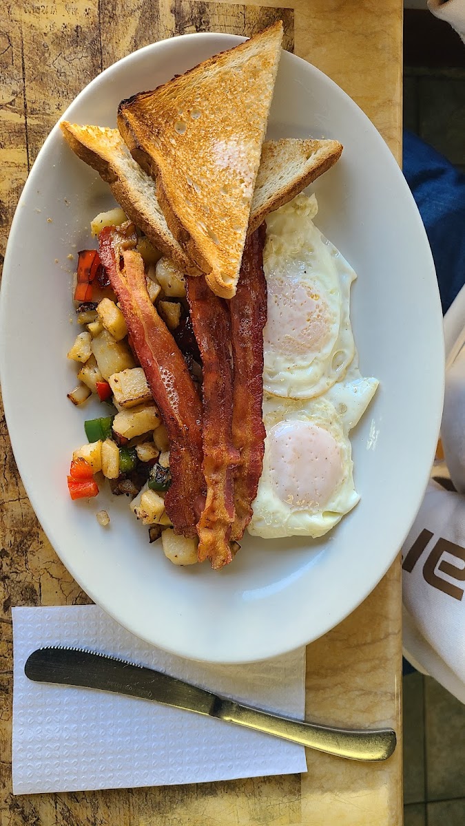 Two large eggs, home fries, 3 pieces Beef Bacon and toast